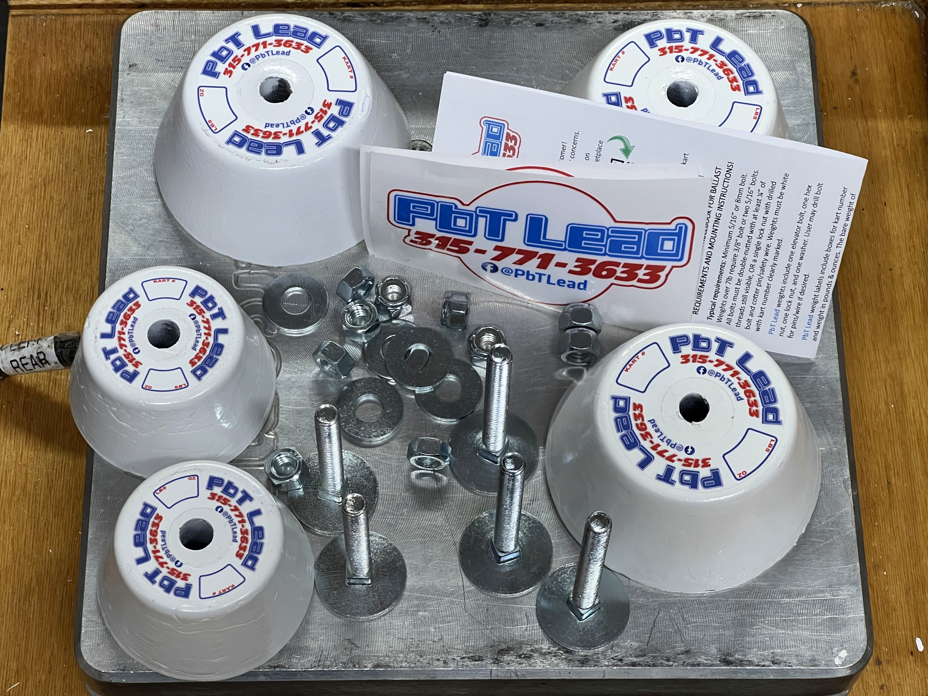 Each lead piece is handcrafted with cast-in mounting holes. All weights are painted white and feature the PbT Lead logo with designated spaces for kart numbers and weight. Each piece includes mounting hardware for quick and easy installation.